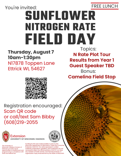 Sunflower Nitrogen Rate Field Day Published on July 29, 2025 by Andrea Thill When: Thursday, August 7th 2025 Time: 10am – 1:30pmWhere: N17878 Toppen Lane, Ettrick, WI 54627Topics: N Rate Plot Tour, Results from year 1, Guest speaker TBD BONUS: Camelina Field Stop