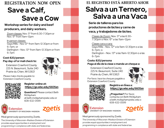 Registrations are due November 1 for the English sessions and October 6th for Spanish. Register online at https://go.wisc.edu/6605sn. Don’t wait to register, participation is limited to the first 20 paid participants per in-person session.