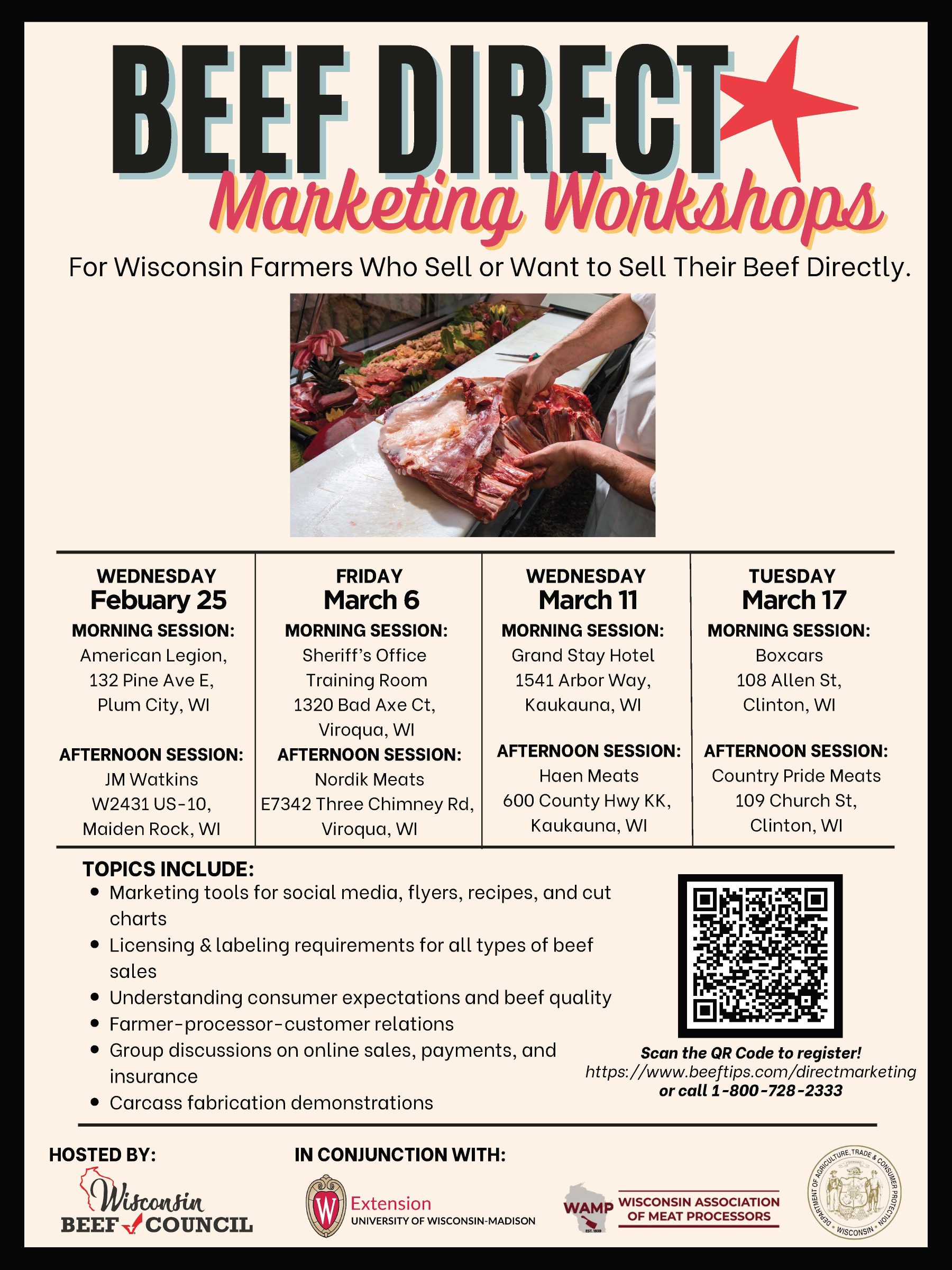 Workshops for Wisconsin farmers who are direct marketing beef, or considering it, will be held in four regional locations in the coming months. The workshops are offered by the Wisconsin Beef Council and are being held in conjunction with the Wisconsin Association of Meat Processors, UW-Madison Division of Extension, and the Wisconsin Department of Agriculture. This will be an opportunity to network with fellow beef producers who are direct marketing, as well as the processors who play a key role in getting beef to consumers.