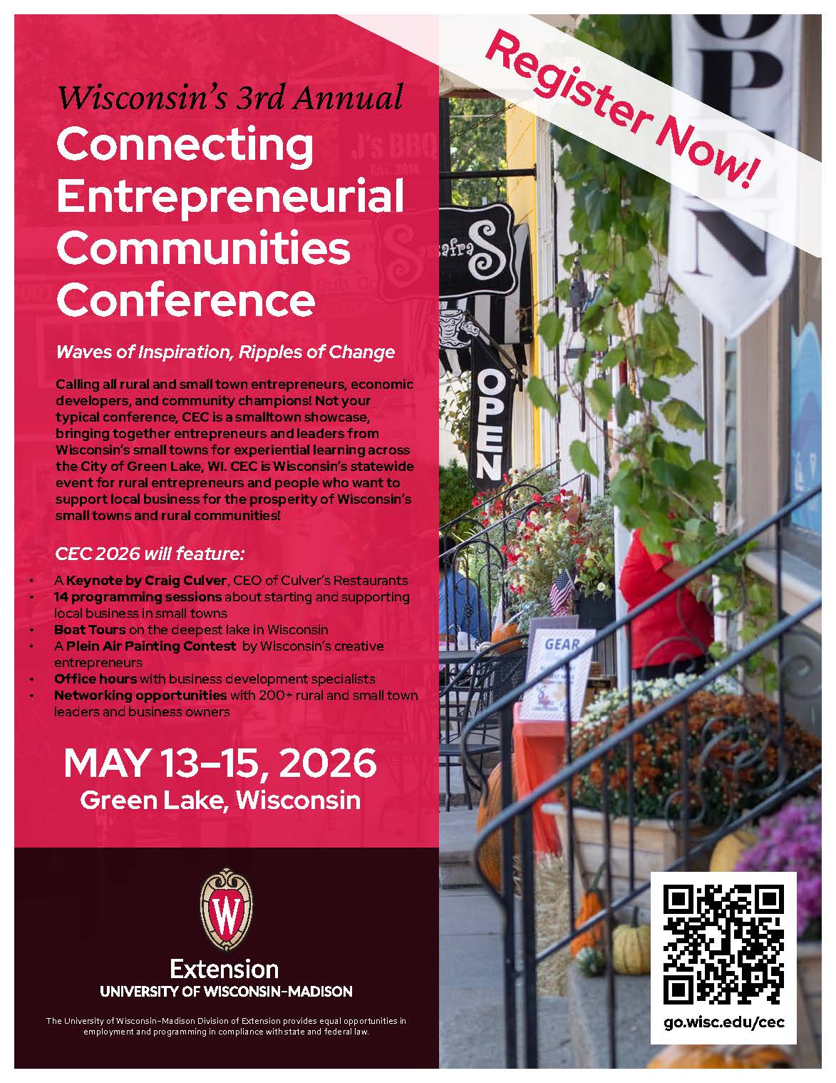Join us for a hands-on, immersive conference designed to strengthen rural Wisconsin’s entrepreneurial ecosystem. Bringing together local leaders, business owners, and innovators, this event explores new ways to grow and sustain thriving local economies.